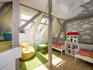 Ha gyermektervezési szándékkal vásárlunk, vagy építünk új házat, hosszútávú tervekkel érkezünk és ennek megfelelően fontos, hogy rugalmas terekben gondolkozzunk. Egy jól kivitelezett tetőtér, melybe a tetősíkba illeszkedő ablakokon keresztül rengeteg napfény és friss levegő áramlik, remek lehetőségeket rejt magában. A tetőtér-beépítéses ház azért is előnyös, mert otthonunk hasznos alapterülete nem a zöld környezet rovására lesz nagy, így élvezhetjük a családi kert nyújtotta előnyöket.