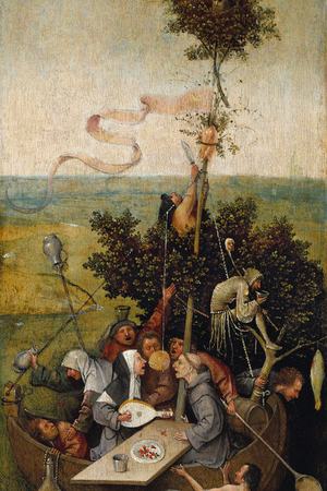 A párizsi Louvre-ból érkezett, Bolondok hajója című táblakép mulatozókkal teli csónakot ábrázol, amelyhez úszó alakok közelítenek. A hajóorr bal felé néz, a csónak távolodik az egykori triptichon elveszett középképétől, és a néző megszokott olvasásirányával ellentétesen, jobbról bal felé halad. Kormányrúdjaként egy nagy kanál szolgál, árbócaként pedig egy fa, amelynek tetején egy bagoly lakik, az északi hagyományban a gonoszság erőinek baljós madara. A fa aljánál nagy, kerek palacsinta, a farsangi búcsúk eledele lóg, amelynek két oldalán egy szerzetes és egy apáca ül tátott. Az ivászat mindenhol jelen van. A csónak oldalán borhűtő lóg, a hátuljában pedig egy hordót látunk. Egy másik apáca kancsóval támad egy férfira. Az egyik úszó alak kupát szorongat, egy másik pedig poharat hord a fején. A legfontosabb szereplő azonban a jelmezes bolond, aki szintén bort kortyol egy kupából, miközben egy ágon ücsörög a hordó felett. Hagyományos öltözetét szamárfül díszíti. A bolondok hajójának kapitány nélküli útját a bomlás és a féktelenség kíséri, végállomása pedig az enyészet és a kárhozat.