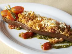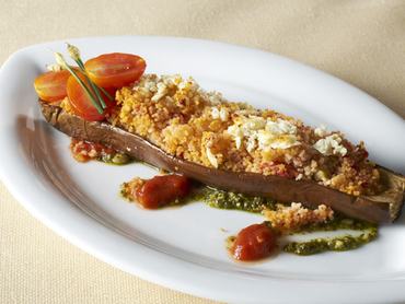 Puhítsd meg sütőben a félbevágott, befűszerezett padlizsánokat, majd kapard ki mindegyik kis csónaknak a közepét és vágd apróra. Dolgozd el a sajton kívül a többi hozzávalóval, majd tölsd meg vele a padlizsánokat. Helyezd a tetejére a sajtszeleteket, és forró sütőben 8-10 perc alatt pirítsd a sajtot a tetejére. A friss petrezselyemmel a tetején tálald.