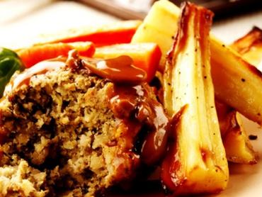 A forró zsiradékok keverékén süsd meg a hagymákat, majd add hozzá a zellert, sárgarépát és a gombát. Löttyints alá egy kevés alaplevet, puhítsd meg a zöldségeket, majd vedd le a tűzről. Forgasd össze a többi hozzávalóval, fűszerezd és egy hosszúkás, kivajazott formában süsd össze 20 perc alatt a forró sütőben.