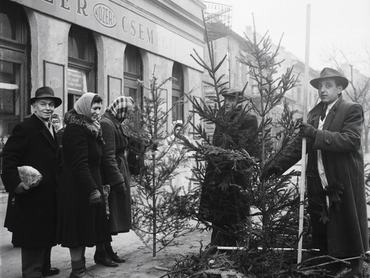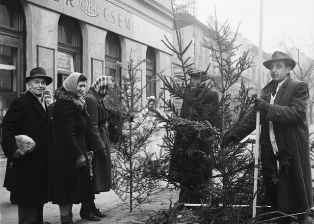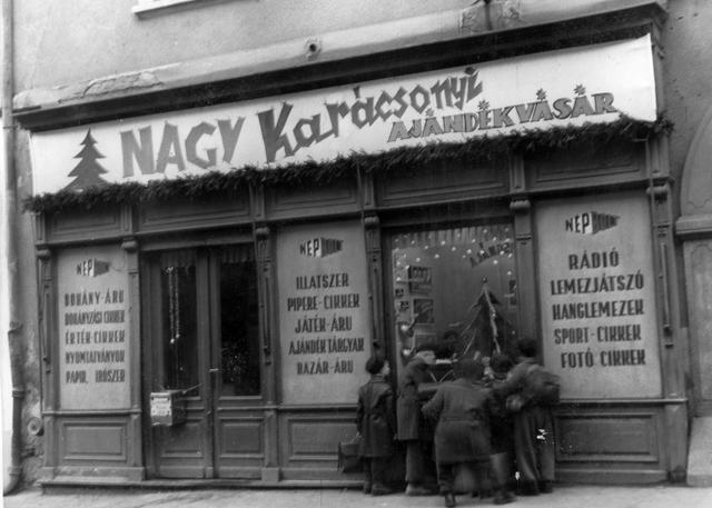 Az ötvenes években, a hiánygazdálkodás és beszolgáltatások ideje alatt nem kis fejtörést okozott, hogyan teremtsék elő az ünnepi asztalra való ételeket. Jegyrendszer volt érvényben; éppen ezért volt örvendetes a bejelentés, miszerint december végétől jegy nélkül, teljesen szabadon vásárolható a kenyér, a liszt, a cukor, a szappan, a tej, a vaj és az iparcikkek. Az 1949-es filmhíradóban külön fejezetet szenteltek annak, hogy megmutassák: decemberben olcsóbb lett a péksütemény és „szabad lett a fehérliszt”, ráadásul a textilek és húsáruk ára is csökkent: két forinttal olcsóbb lett a disznóhús a hároméves tervnek és „Népköztársaságunk kormányának” köszönhetően. A nemes gesztusnak egy szépséghibája volt: sem jeggyel, sem anélkül nem lehetett hozzájutni szappanhoz, iparcikkekhez, de még szaloncukorhoz vagy fenyőfához sem a boltokban.