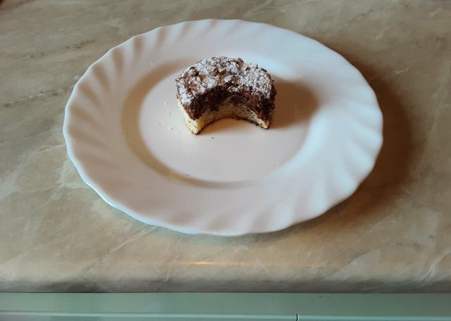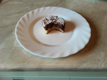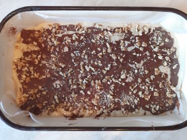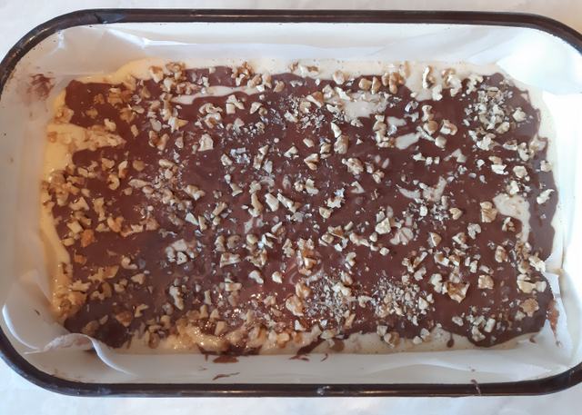 A massza 70 százalékát beleöntjük egy kis méretű, sütőpapírral bélelt tepsibe, a maradékhoz hozzákeverjük a kakaót, és ezt a kakaós masszát véletlenszerűen összevissza ráöntjük a tepsiben lévő tésztára. A tetejére ízlés szerint apróra vágott diót szórunk.