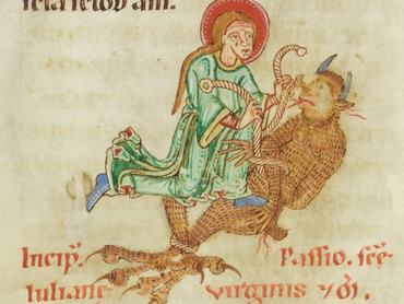 Szent Julianna legendája az ókor óta népszerű története a katolikus legendáriumnak és hiedelemvilágnak. A történet szerint Julianna a kis-ázsiai Nikomédiában született 286 körül, gazdag pogány családban. Apja, Africanus kilencéves korában eljegyeztette a lányt egy Eviláziosz nevű pogány férfival. Amikor Julianna 18 éves lett, az időközben kormányzóvá kinevezett Eviláziosz követelte a jussát, a lány azonban addig nem volt hajlandó hozzámenni, amíg a férfi meg nem tér és fel nem veszi a keresztény hitet. A kormányzó ezért bíróság elé állíttatta, majd kínzásnak vetette alá Juliannát. Fél napon keresztül a hajánál fogva lógatták, majd forró ólmot öntöttek a fejére, de ő sértetlenül állta a csapásokat. Így végül vasláncra verték és börtönbe vetették.