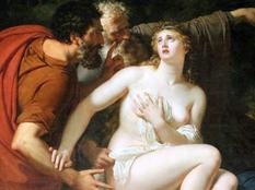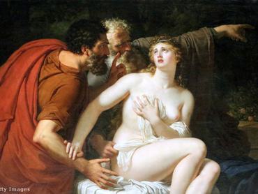 Zsuzsanna története az Ószövetségben, Dániel könyvének függelékében olvasható, és csak a katolikus kánon tartja a Szentírás részének, a protestáns Bibliában nem szerepel. A Kr. e. 6. században, a babiloni fogság idején játszódó történetben a szépséges, de jóravaló és istenfélő Zsuzsanna (nevének jelentése: liliom) a gazdag Joákim felesége, akinek háza egyben zsinagóga és a peres ügyek elintézésére szolgáló hely is. Két öregember, a férj gyakori vendégei, a kertben meglesték és megkörnyezték a fürödni készülő Zsuzsannát, ő azonban visszautasította közeledésüket. Bosszúból a két öreg megvádolta az asszonyt, miszerint látták őt egy fiatal férfival szerelmeskedni. A közösség hitelt adott a két tekintélyes férfi szavának, bíróság elé idézték, és házasságtörésért halálra ítélték az asszonyt.