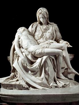 Utóbbival kapcsolatban egy apró csalással élt a művész: azért, hogy valóban ókorinak tűnjön a szobor – és így magasabb áron tudja eladni –, szándékosan megöregítette, többek között elásta a földbe. A csalásra hamar fényt derült, büntetés helyett azonban jutalmat kapott az alkotó. A szobor tulajdonosa, Raffaele Riario bíboros meghívta Michelangelót Rómába, hogy neki dolgozzon. Ebből a meghívásból született a Pietà márvány szoborcsoport, mely ismertté tette Michelangelo nevét, és beindította a karrierjét. Habár a Krisztust sirató Mária témáját sokan feldolgozták már korábban, ő volt az első, aki sokalakos kompozíció helyett mindössze Jézust és édesanyját ábrázolta. Művéről így nyilatkozott: „Megláttam az angyalt a márványtömbben, és addig véstem, míg ki nem szabadítottam”.