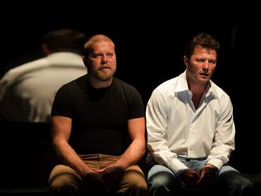 A kétszereplős előadás egyébként minimáldíszlettel (a vallatószobában egy asztalt és két széket látunk) és a folyamatos monológ-, illetve dialógfolyamnak köszönhetően hömpölyög előre, az akciókban bővelkedő történet véres jeleneteit is csupán a két zsaru elmondása alapján rekonstruálhatjuk. Puskás Tamás sokkal inkább a két emberben zajló lelki tusákra, az egymásnak feszülő érdekekre koncentrál, amikhez képest a lövöldözés és verekedés színpadi megjelenítése puszta látvány lenne – bár néha egy-egy jelzésértékű akciót azért el tudtunk volna képzelni.