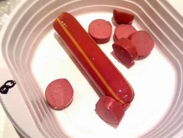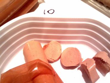 Az első meglepetés az volt, hogy a virslinek szép a színe, és nem a róla lebontott műbélnek. Ez eléggé megnyerő volt, és kíváncsian vártuk, hogy ízre hogy bizonyít. Sajnos, a várt hatás elmaradt, íztelen, szagtalan, olyan mintha gumit rágna az ember.