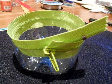 Találja ki, hogy milyen magasságú tároló lenne ideális, és eszerint jelölje be a palackok oldalát, majd vágja körbe. Ezután mérje ki a szükséges hosszúságú cipzárat, vágja méretre (mi 30 centist vettünk a másfél literes palackhoz, és ebből kicsit vágni kell) és ragassza a flakonok belsejébe a textilcsíkjánál fogva úgy, hogy a fogak persze kifele álljanak.