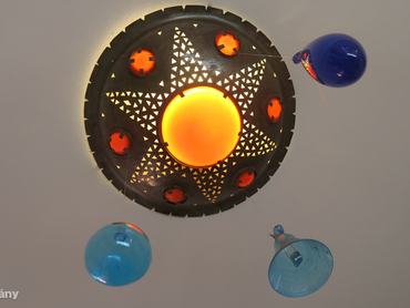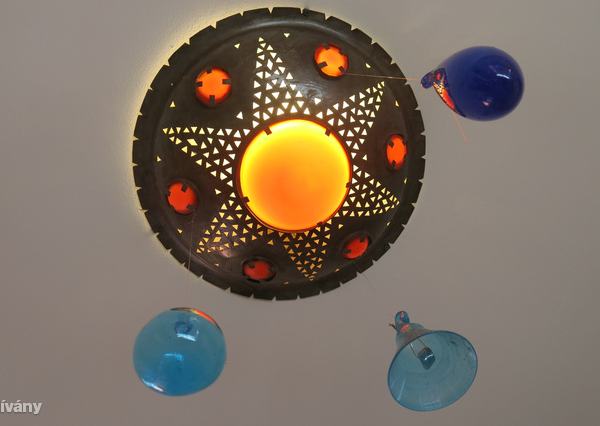 Imádom a marokkói enteriőrt, ugyanakkor kicsit bátortalanul használom az erős színeket, mert a minimalista, letisztult stílust is szeretem. Nagyon csábított, hogy valamilyen csilli-villi, keleties függőlámpát vásároljak a nappaliba, de végül emellett a lapos plafonlámpa mellett döntöttem - azért megtartva a marrokói stílusjegyeket is. Ám pár héttel később már kicsit bántam, hogy nem voltam bátrabb, így aztán kimentem a bolhapiacra, és összeszedtem pár üveg csecsebecsét - csengőt, aprócska lámpabúrát, ezt-azt-amazt, és egy-egy damilra felhúzva felaggadtam őket a lámpára. Ha felkapcsolom a fényt, gyönyörűen átvilágít az üvegcsengőkön, ráadásul bármikor cserélgethetem a függődíszeket, ha utazgatások során, vagy a piacon flangálva találok valami izgalmas darabot.