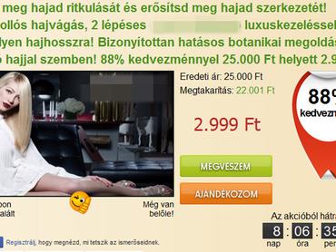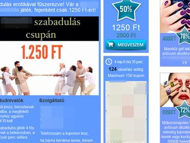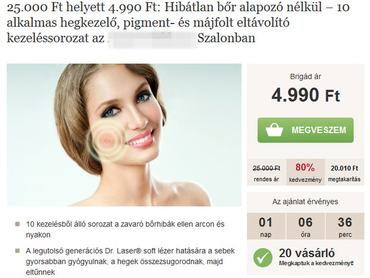 Ha valami gyakran 90% közeli kedvezménnyel tűnik fel ezeken az oldalakon, az a fiatalító/feszesítő/fogyasztó testkezelések. Bármikor támad kedve kipróbálni egy ilyet, biztos talál több alkalmas kúrákat, amik nem kevesebbet ígérnek, mint szép bőrt, néhány letagadható évet, vagy évek óta meglévőkilók, esetleg bőrhibák eltüntetését. Arra azért figyeljen a leírásban, hogy mekkora területre érvényes a kupon, nehogy féloldalas legyen a fiatalodás. Éppen az egyik legnépszerűbb eljárás, a testzsírfagyasztás során járhat úgy, hogy míg az egyik combjáról néhány ezer forintból lefagy az összes zsír, a másik combját viszont kifizetheti aranyárban, mert nem volt elég körültekintő. Legyen szó tekercselésről, liposzómás kezelésről, fagyasztásról, olvasztásról, komplex alakformálásról, biztos, hogy előbb-utóbb mindenhez talál kupont. Ugyanígy mindig van szoláriumbérlet, általában egyszerre több akció is - ahol természetes barnulásról írnak egy általában természetellenes árnyalatú modell képe mellett -, amihez szintén átlag 50% kedvezménnyel lehet hozzájutni.