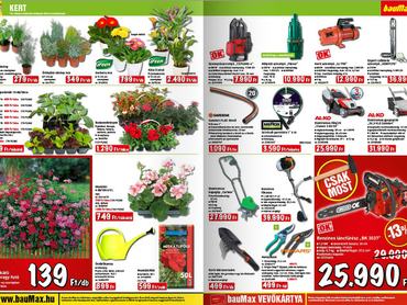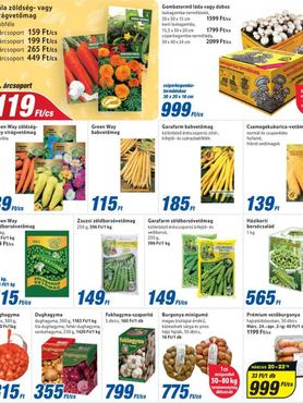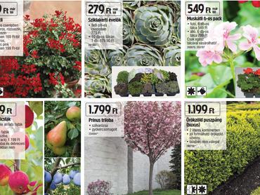 Itt gyümölcsfákhoz is juthat akciósan: almafákat 999 forintért vehet, a körte, szilva és őszibarack pedig 1199 forintba kerül. A muskátli itt 169 forint, hatos tálcában pedig 549 forintért kapható, de sziklakerti évelőket is kap 279 forintért, vagy eperpalántát 249 forintos áron. A szilvarózsa fa 1799 forintba kerül, de ha inkább tuját ültetne a kertbe, azt is talál 999 forintért, gömb tuját pedig 1199 forintos áron. Több fajta fűszernövény közül választhat, 249 forintért 9 centis cserépben vásárolhatja meg őket.
