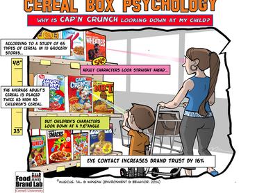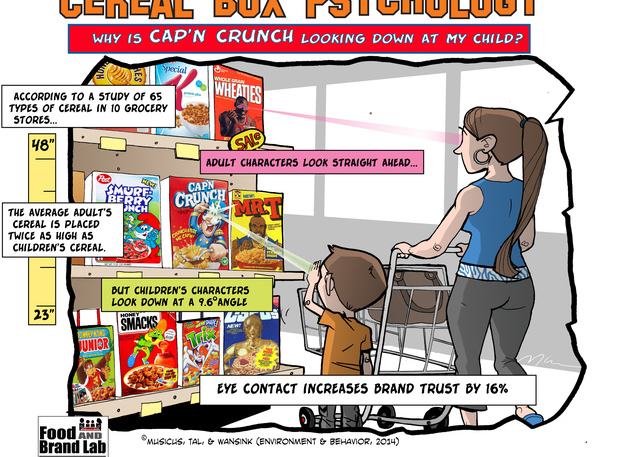 A Cornell Egyetem kutatása amerikában 65 müzlit vizsgált, ezzel együtt 86 reklámfigurát 10 boltban. A vizsgálat során kimutatták, hogy az állatfigurák többsége úgy lett megtervezve, hogy a polcokról nemcsak a vásárló tekintetét keresik, de ráadásul egy kicsit lefelé is néznek. Igen, épp azért hogy szemkontaktust találjanak a gyerekekkel, aki szinte hallja is, ahogy a bőrkabátos tigris vagy a vagány oroszlán kéri őt, hogy beszélje rá a szüleit a müzlire. De nem csak a gyerekek vannak ennek a veszélynek kitéve a tanulmány készítői szerint, hiszen a felnőtteknek szánt gabonapelyhekről visszamosolygó emberek képe is úgy kerül a dobozra, hogy pont a vásárló szemébe nézzenek. A hatásmechanizmus mindössze a polcmagasságon múlik.