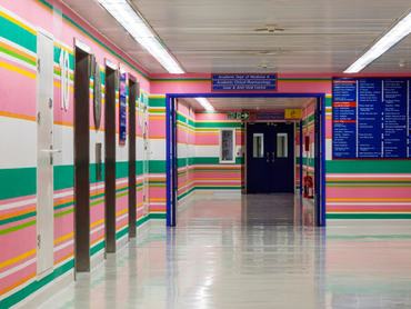 A gyógyítólag ható színes csíkokat az ismert Op Art művész, Bridget Riley festette fel a kórház falára.