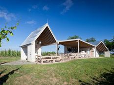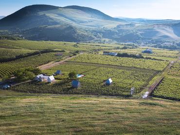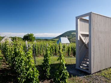 „A borkóstolókhoz készülő teraszt négy kisebb kunyhó és a terület sarkában egy kilátó építmény egészíti ki. A kunyhók a szőlővidék archaikus építményeinek viselkedését, arányait és anyaghasználatát követik, a terasz hajtogatott lemezei pihenésre és kóstolásra biztosítanak teret a festői környezetben.” – olvasható az építésziroda oldalán a projektről, melyben a borospince és terasz mellet pihenésre és alvásra alkalmas kabinok, egy kilátó, medence és kemping is helyet kapott.