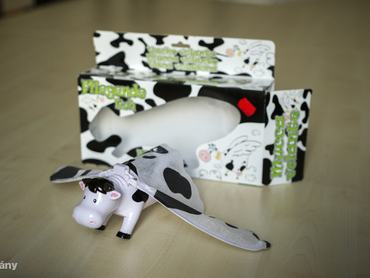 A repülő tehén két ceruzaelemmel működik, amit a hasába kell beleműteni, majd ezután a torkán lévő kapcsolóval bírhatjuk működésre. A jószág ekkor verdesni kezd a szárnyaival, ami már önmagában is tökéletes élmény, de ezt tovább fokozhatja, ha a hozzávaló akasztó és zsinór segítségével rögzíti a plafonra és gyengéden meglöki egy kicsit. Akkor körözni kezd, így: