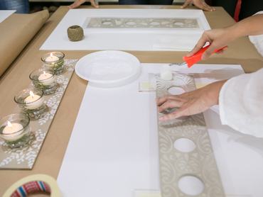 Miután egyesével végigpróbáltuk a falfestést, mindenki választott magának egy sablont és egy adventi gyertyatartót, akinek meg nem jutott a kinézett sablonokból, az párnahuzatot kezdett festeni. Mi madaras motívummal próbálkoztunk a gyertyatartónál, nem is lett volna semmi gond, ha alaposan leitatjuk a festéket a szivacshengerről – de, ugye, mire ez kiderült, már elfolyt a festék alatta. Tényleg fontos ügyelni arra, hogy ne hagyjunk rajta sok festéket: inkább menjen át többször ugyanazon a felületen, hogy mindenhol egyformán fedjen a festék, de ne vigyen fel egyszerre sokat, mert azzal könnyen elronthatja a munkát. Amennyiben csak három sarkát rögzíti, úgy közben megnézheti, hogyan alakul a minta, hol szükséges többször átmenni rajta. Kedvtől és időtől függően pedig próbálkozhat nyomáserősséggel, árnyalatokkal is, aztán ha kész van, tegye félre pár órára száradni. Mi vaksszal is lekentük a mintát, hogy kevésbé kopjon, de erre nem minden festéknél van szükség, úgyhogy kérdezze meg ezt a boltban, mielőtt megveszi a festéket.
