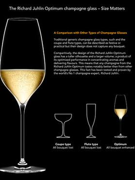 „ A tervezés mellett a szigorúan vett paramétereket volt a legnehezebb betartani” – mondják a tervezők, akik a klasszikus értelemben vett magasított pohár formát tökéletesítették, szem előtt tartva a szénsavas ital optimális levegő- és folyadékarányát is. „A magas nyakú, egyenes oldalú keskeny pohár részben hasonlít a szűk pálinkás pohárhoz, melyet szintén talppal és magas nyakkal láttak el annak érdekében, hogy a pohárba öntött italt megkíméljék a hőmérséklet változástól. A pohár belsejét úgy alakították ki, hogy a benne lévő pezsgő szénsavas maradjon, miközben a kissé gömbölyded forma vizuálisan felnagyítja a felszínre érkező buborékokat. A kisebb átmérőnek köszönhetően pedig több pohár is elfér a tálcán egyszerre” – magyarázza az 1962-ben született svéd pezsgő szakértő, aki a „Juhlin line” nevű halvány jelölés bevezetésével az ideális töltési szintet szeretné érthetővé tenni a laikusok számára.