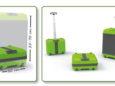 A Fugu ugyanis felfújható oldalfalakkal rendelkezik, amit természetesen beépített pumpa működtet. A levegő hatására a kis méretből (34,3 cm X 54,6 cm X 22,8 cm) jóval nagyobbá lehet alakítani (34,3 cm X 54,6 cm X 68,6 cm) és ez még nem is minden. Teljesen kinyitott állapotában ugyanis kisebb utazószekrénnyé változik, fiókokat és polcokat is rejt, sőt akár vállfával együtt is beleakaszthat ruhákat.