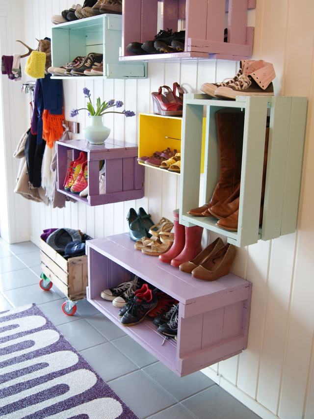 A Thea's Mania blogon jelent meg egy csodás ötlet, amely azóta elözönlötte a Pinterestet. A massziv dobozok lefestve és a falra rögzitve egy csomó plusz helyet biztosítanak. Arra érdemes figyelni, hogy a zöldségestől elkunyizható mandarinos dobozok nem túl erősek, érdemes addig keresni, míg megfelelő ládára bukkanunk. Onnantól csak egy kis csiszoláss és festés vár ránk.