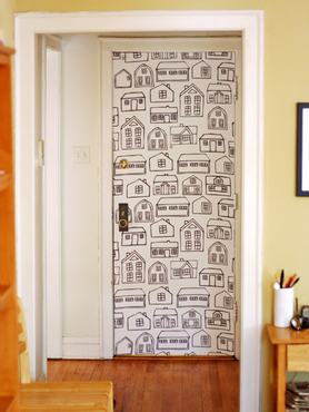 Jessica Jones textil desginer kísérletezett azzal, mi lenne, ha az ajtaját festés helyett némi anyaggal dobná fel. A méterárun kivül csak kukoricakeményítőre van szükség az anyag rögzítéséhez. Nem viccelek, a recept a következő: