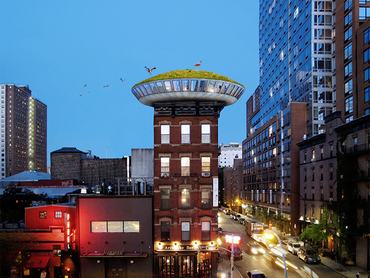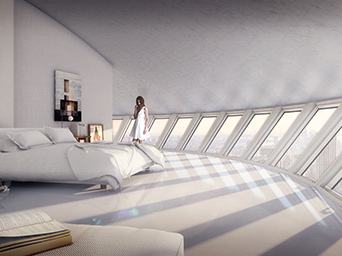 A loft ugyan egy kicsit erős kifejezés, mert bár tényleg egybefüggő, hatalmas térrel dolgozik a tervező, a felújítottól elég messze áll. Az elképzelésben a magasabb, de nem felhőkarcoló magasságú épületek tetejére tett egy igen érdekes lakást. A kör alaprajzú ingatlan minden külső falát ablakok borítják, vagyis a kilátás 360°-os, ami azért nem semmi. Természetesen a zöldprojekt a környezetre is gondol, így a lakás teteje földdel borított, füvezett tetőt kapott. Ez több szempontból is nagyon jó megoldás: egyrészt a szigetelése nagyon jó, így spórolni lehet a fűtéssel, másrészt a madaraknak is élőhelyet biztosít, valamint javítja a város levegőjét.