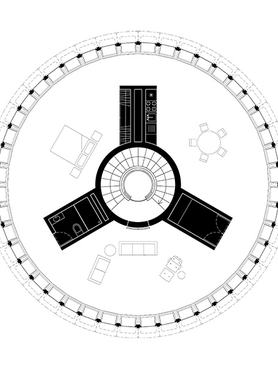 Mindezt a tervező egy középső tengely köré tervezte, ahonnan a lakás bejárata is nyílik, ez ugyanis a lépcső, valamint a lift helye. A kifelé dőlő falakon lévő ablakok körpanorámájának köszönhetően a lakás világos, ám az ablakok valószínűleg - balesetvédelmi meggondolásból - nem nyithatóak, így a friss levegőről vélhetően szellőztetőrendszer kell gondoskodjon.