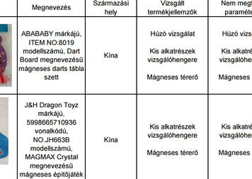 Az egyik játék egy mágneses darts. A játék veszélye az, hogy a nyíl száráról könnyen letekerhető a mágneses alkatrész. Az úgynevezett mágnesesfluxus-indexe pedig a megengedett több mint a hatszorosa. A másik játék egy mágneses építő készlet volt, melynél már a készlet eleve tartalmazott könnyen lenyelhető mágneses alkatrészt. A mágnesesfluxus-index esetében itt is a megengedett érték többszöröse volt kimutatható.