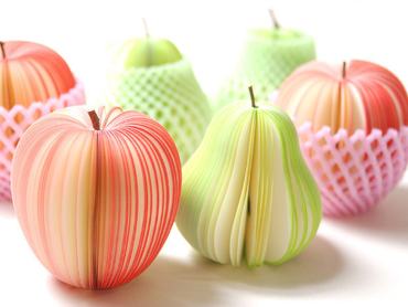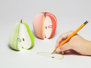A Kudamemo, vagyis a gyümölcs jegyzettömb is egy hasonló tárgy – tudhatjuk meg a gizmodiva.com-ról. Irkálni is lehet rá, de valóban nagyon jól néz ki, így valószínűleg ebből is csak porfogó lesz. A vékonyra szeletelt alma és körte még a csomagolásában is emlékeztet az eredeti gyümölcsökre, arról már nem is beszélve, hogy a hatás fokozása érdekében igazi gallyakra építették rá a tömböt.