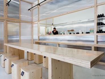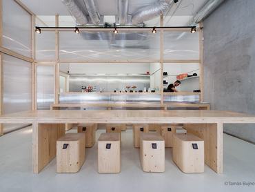 „Az üzlettér belső elrendezése jól követi a távol-keleti hagyományokra építő, világszerte hódító hasonló levesezők építészeti mintáját: hosszú asztaloknál, egymás mellett ülnek a vendégek, illetve fontos szerepe van a konyhával szinte teljesen egybenyitott pultnak, ahol a szakács közvetlenül ki tudja adni az elkészült levest. A helyiség közepén végighúzódó hosszanti, nagyon leegyszerűsített szerkezetű, de mintázatban, rétegekben gazdag nyersfa nagyasztalnál a vendégek egymással szemben ülhetnek. A vendégtérben a nyersfa és transzparens elemek dominálnak, egyik falon mindez egy nagy, de nem súlyos látszóbeton felületben végződik.”
