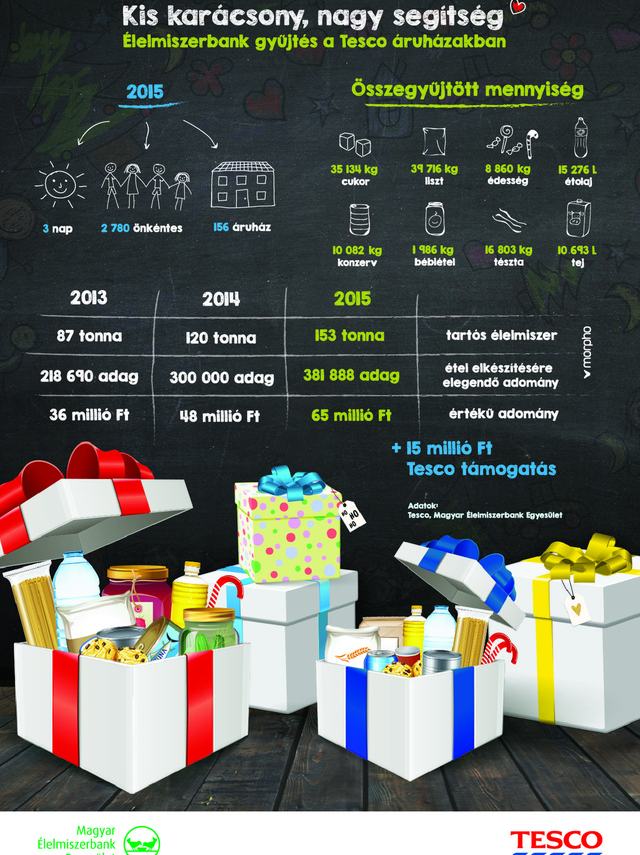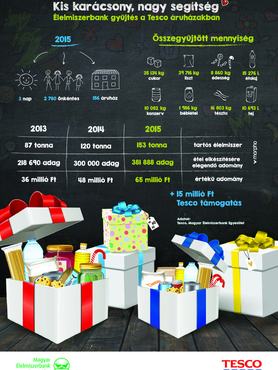 A Tesco és az Élelmiszerbank a karácsonyi gyűjtés mellett egész évben közösen dolgozik az élelmiszerfelesleg hatékonyabb felhasználásáért,erről korábban írtunk is. A 2013 óta tartó együttműködés kezdete óta az áruházlánc eddig összesen közel 580 tonna még fogyasztásra alkalmas élelmiszert adott át az egyesületnek, amellyel közel 300 000 nélkülöző ellátását segíti napi szinten.