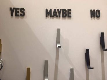 A TIPO Budapest Facebook csoportba posztolták az alábbi fotót, amelyen egy Arena Plazás próbafülke (állítólag a Pimkie üzletében található - a szerk.) belseje látható. Számunkra nem a használt betűtípus benne a hírértékű, hanem az, hogy a tervezők voltak annyira segítőkészek, hogy nemcsak egy rakás akasztót kapunk a megszokott egy vagy kettő helyett, de ráadásul a Yes, Maybe, No (Igen, Talán, Nem) feliratokkal csoportosították is őket. Így ha több ruhadarabot próbál, már nem kell a negyedórás szeánsz után azon agyalnia, hogy melyek is voltak azok, amiket tutira elvisz; melyek azok, amelyeket újra meg szeretne nézni, esetleg más méretet keresni belőlük; és mik azok, amiket semmiképp sem vesz meg.