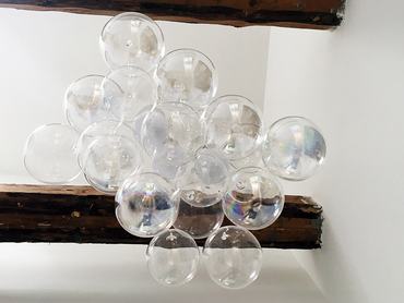 Végül a német eBay-en találtam egy üvegművest, aki árult ilyen fellógatható, fújt gömböket, több méretben is, vállalható árú szállítással. Szintén a német eBay-en találtam egy másik céget is. Ezek a gömbök víztiszták, nem irizálóak, de abban bíztam, hogy a meglévő színjátszósok mellett ez nem fog feltűnni, ez bejött. Viszont kizárólag víztisztából nem raknám össze a csillárt, pont a buborékhatás veszne el.