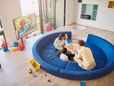 A több funkcióval ellátott Lego tárgyak és kiegészítők a legmeglepőbb helyeken bukkannak fel a vidám, gyerekbarát lakásban; a nappali központi része például nem a televízió, hanem a Lego Play Pond néven futó kör alakú kék kanapé, ami a tervező elmondása szerint egy „varázslatos szigetként vagy titkos barlangként” szolgál a szürke hétköznapokban, de amellett egyfajta nyári hangulatot is csempész a lakásba - írja a designboom.com.