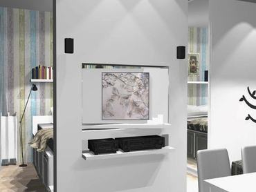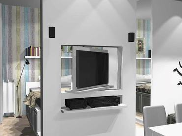 A másik megoldás szintén bútorba szerelt készülék, de itt az elrejtés valójában azt jelenti, hogy hol az egyik oldalon, hol a másik oldalon látható a tévé, mivel ebben az esetben egy forgatható szerelvény segítségével lehet a tévét „eltüntetni”. A tévé mögötti hátfalat lehet dekorálni, így amikor nem a monitor van elöl, akkor akár egy festményt, akár dekorációs tárgyakat látunk az adott térben.” – mondja Zsoltai Tünde lakberendező, látványtervező.