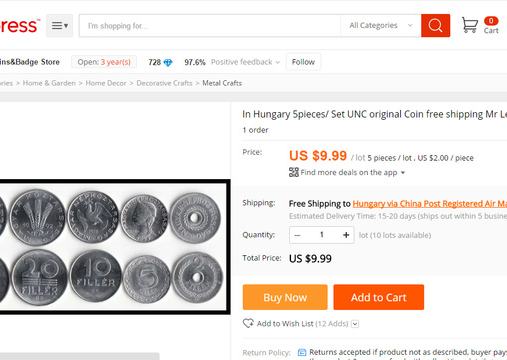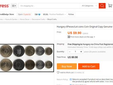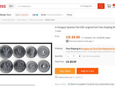 Sokszor írtunk már róla, hogy a világ legnagyobb online boltját a kínaiak üzemeltetik: az Aliexpressen mindent, de tényleg mindent lehet kapni, még azt is, amiről sosem gondolná, hogy létezik. De hogy a szocializmus alatt és előtt használt fémpénzeinket és fillérjeinket is meg lehessen ott vásárolni, azt sosem gondoltuk volna. Nem is beszélve a jelenleg is használatos érmékről, amelyeket meglehetősen drágán próbálnak rásózni a gyanútlan vásárlókra. 5 darab fillér 9.90 dollárért (2760 Ft) egyáltalán nem olcsó, főleg ha hozzávesszük, hogy a Magyar Népköztársaság feliratú 10 filléresből nem kevesebbet, mint 12.015.000 darabot gyártottak le, és még a Forintportál.hu numizmatikai szakoldal szerint sem egy menő darab, 40 forintért bármikor tudunk vásárolni belőle. A már ritkább ötfilléreshez is viszonylag olcsó hozzájutni, szóval ha nosztalgiázna egy jót, vagy kezdő gyűjtőként megalapozná a kollekcióját, ezt semmiképp se az Aliexpressen tegye, mert annyit biztosan nem érnek a fillérek, amennyit a kínaiak kérnek értük.