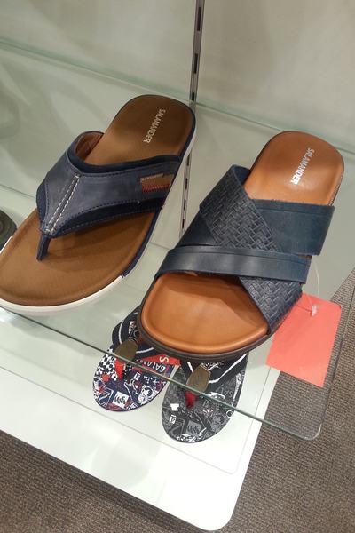 A Salamander valamiért betárazott bőrpapucsokból, olyasmi stílusban, mint ami itt alább is látható. Fogalmam sincs, ilyesmit hova vesznek fel a férfiak, utcán még nem láttam hasonlót, strandra meg jachtklubba mondjuk nem járok. Szóval az ehhez hasonló darabok átlagosan 15 ezer forint körüli áron kaphatók (leárazva!), de van lábujjközös Napapijri papucs 10 ezerért és kifejezetten strandos Gant papucs 15 ezerért. Kapható vitorláscipőnek látszó félcipő is (csak fekete a talpa, ami nem ér), és van 43 ezerért zokniért kiáltó lyukacsos bőrcipő is. Ha nem tudja elképzelni, nézze meg a galériában, talál ott Birkenstockot és leárazott Versacét is!
