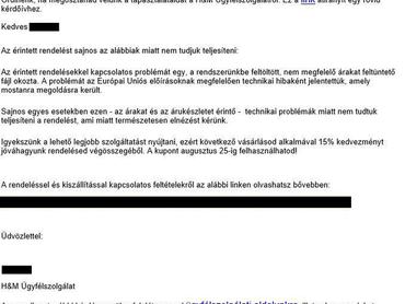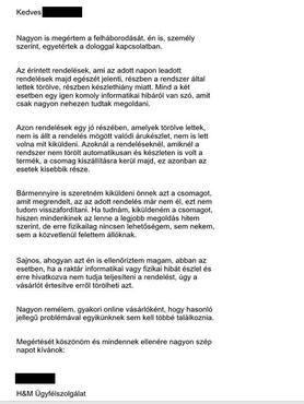 A vásárlók természetesen tömegével írtak panaszleveleket a H&M Vevőszolgálatainak, akik készséggel válaszoltak is az üzenetekre, igaz néha a nevet nem találták el, de a lényeg egyébként is a magyarázat lett volna. Minden esetben technikai hibára hivatkoztak, amit a rendszerükbe feltöltött hibás file okozott. Egy hosszabb sablon válaszlevél is kering az interneten, ott már árukészlethiánnyal is magyarázták a rendelések törlését.