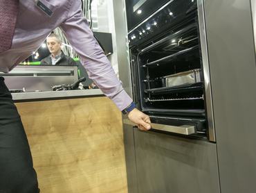 A Neff standján a helytakarékosság állt a középpontban, láttunk olyan páraelszívót, ami szépen lassan belesüllyedt a konyhapultba, de megnéztük azt a beépíthető sütőt is, aminek az ajtaját egészen egyszerűen be lehet csúsztatni a sütőtér alá, vagyis azzal már nem égeti meg lábszárát, amikor odalép kiemelni a sülteket, és nem foglal felesleges helyet sem a konyha területéből. Természetesen ennek is színes érintőkijelzős kezelőfelülete van, amivel kiválaszthatja, hogy éppen mit szeretne sütni, hogyan, milyen hőfokon és mennyi ideig. A legolcsóbb elrejthető ajtóval felszerelt sütő 549.990 forint.