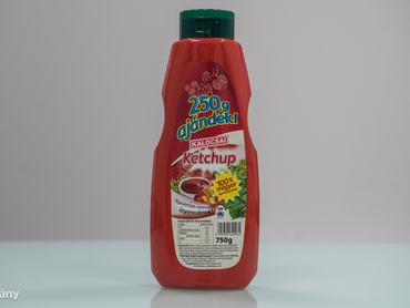 Talán nem annyira meglepő, hogy a Kalocsai ketchupot szintén a Kalocsai Fűszerpaprika Zrt. gyártja. A Kőröshöz képest nincsenek is jelentős különbségek: szinte ugyanolyan a flakonja, és 100 százalékban magyar paradicsom kerül bele – sajnálatos módon a két tartósítószerrel együtt. Ízre egy picit jobban vizsgázott a másik terméknél. Legalábbis az elején, mert a kezdetben észlelhető kellemes aromákat rövidesen savanykás vegyszeríz vágta tönkre.