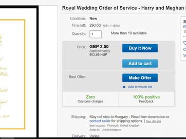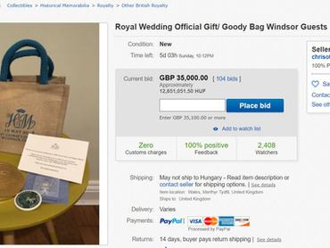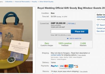 Az, hogy az ifjú pár egy kis köszönőajándékkal készül a meghívottaknak, nem új keletű dolog, itthon is bevett szokás lett. Persze a királyi család nem egy egyszerű bonbonnal vagy kis üveges saját címkés pálinkával készül, hanem egy egész ajándékszatyorral, amit a vendégségbe érkezők egy része már az esküvő után azonnal feltett az internetre, elképesztő áron. Volt, aki már a helyszínen fotózta a darabokat, hogy ezzel is bizonyítsa, hogy ez bizony eredeti, az eredmény pedig magáért beszél, tulajdonképpen már akkor is jól járt az illető, ha cserébe egy kicsit leégett a napon.