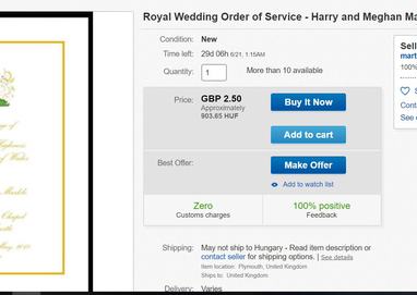Az eBay-en vannak olyanok, akiknek a csomag bőven 10 millió forint feletti összeget megér, ráadásul nem is egy licit lépte már túl ezt az értékhatárt. Pedig nem kell semmi extrára gondolni, nincs benne dedikált fotó az ifjú pártól, nincs benne a királynő telefonszáma sem, van viszont egy füzet az esküvői műsorról, egy térkép a kastély kertjéről, egy egyedi csomagolású víz, Harry herceg és Meghan Markle üdvözlőlevele (persze nem kézzel írt), egy nagy csokoládéérme, ami szintén kifejezetten erre a napra készült, keksz, illetve egy kupon, ami 20 százalék kedvezményre jogosít a kastély ajándékboltjában, és persze egy szintén erre a napra készült vászontáska.