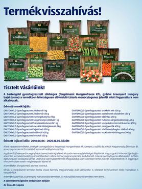 A 2018. 06. 06 és a 2020. 12.12 közötti lejáratú, különböző kiszerelésű Gartengold termékek érintettek. Ezeket az üzlethálózat le is vette a polcairól, de arra kérik a vásárlóikat, hogy az érintett megvásárolt termékeket azonnal vigyék vissza az áruházakba, a vételárat pedig blokk hiányában is visszatérítik. Hogy pontosan melyik Gartengold termékekről van szó, azt az alábbi felhívásban láthatod.