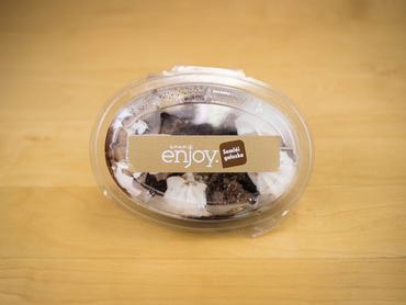 Összetevők: kakaós öntet (55%), [ivóvíz, cukor, pudingpor (cukor, módosított keményítő, 2% zsírszegény kakaópor, étkezési só, aroma), aroma, tartósítószer: kálium-szorbát], 21% vaníliaízű krém {ivóvíz, krémpor [cukor, módosított keményítő, tejsavópor, növényi zsírpor (kókuszolaj, maltodextrin, módosított keményítő), aromák, sűrítőanyag: nátrium-alginát; savanyúságot szabályozó anyag: citromsav; étkezési só, színezék: annato], növényi hab [ivóvíz, teljes mértékben hidrogénezett pálmamagolaj, cukor, tejfehérje, emulgeálószerek: zsírsavak mono- és digliceridjeinek tejsav-észterei, lecitinek (szójából), zsírsavak mono- és digliceridjeinek diacetil-borkősav-észterei; stabilizátorok: cellulóz, nátrium-karboxi-metil-celluóz, kálium-foszfátok; aroma, színezék: karotinok; tartósítószer: kálium-szorbát]}, 12% növényi hab, [ivóvíz, teljes mértékben hidrogénezett pálmamagolaj, cukor, tejfehérje, emulgeálószerek: zsírsavak mono- és digliceridjeinek tejsav-észterei, lecitinek, (szójából), zsírsavak mono- és digliceridjeinek diacetil-borkősav észterei, stabilizátorok: cellulóz, nátrium-karboxi-metil-celluóz, kálium-foszfátok; aroma, színezék: karotinok; tartósítószer: kálium-szorbát], 10% piskótatészta [búzafinomliszt, tojáslé (tojás, étkezési sav: citromsav), cukor, ivóvíz, piskótastabilizáló keverék (stabilizátor: szorbitok; emulgeálószerek: zsírsavak mono- és digliceridjei, zsírsavak poliglicerin-észterei; ivóvíz), sütőpor (térfogatnövelő szer: nátrium-hidrogén-karbonát; kukoricakeményítő, stabilizátor: difoszfátok), tartósítószer: kálium-szorbát], dió, mazsola.