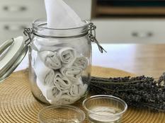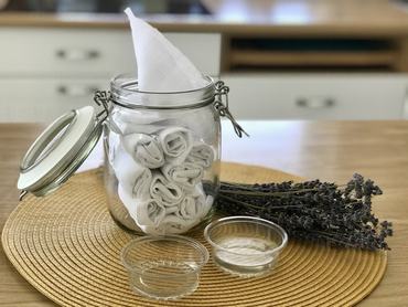 Elkészítés: Keverjük össze a hozzávalókat, és tegyük bele a tetszés szerinti méretre vágott, jó nedvszívó képességű textileket (feldarabolt régi póló, konyharuha, törölköző vagy textilpelenka is lehet). Kiadós fürdőzés után csavarjuk ki a kendőket, és tegyük egy nagyobb zárható üvegbe vagy dobozba.