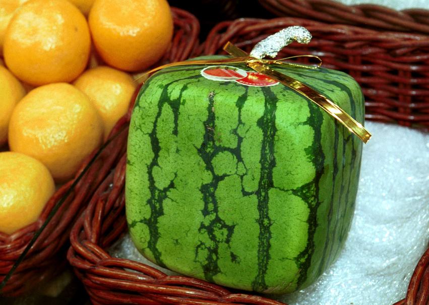 Az ötlet szintén Japánban bukkant fel, de 2014 óta már a világ többi részén is lehet kapni. Azon túl, hogy ezeket a görögdinnyéket dobozban termesztik, hogy a képen látható formát kapják, az ízük ugyanaz, mint a normál görögdinnyéknek, semmi más különlegesség nincs bennük. Talán még az ára, ami egy 13 kilós darab esetében 800 dollár.