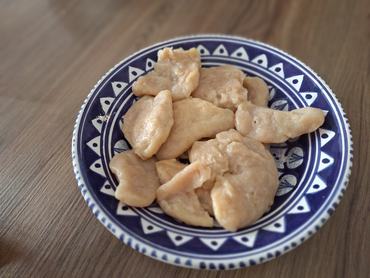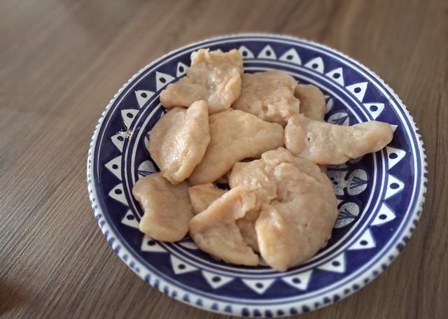 Nem kell megijedni, a tésztadarabok először lesüllyednek a vízben, aztán annak tetejére emelkednek, és ott egészen hússzeletszerű alakot öltve úszkálnak, míg főnek, fél órán keresztül. A végeredményt egy tálba szedve az a meglepő látvány fogadott, hogy ha fotón látnám, tényleg nyers csirkének nézném a szejtánomat. Igaz, a felülete nokedlisen nyálkás volt, de azt reméltem, az majd a sütés révén megváltozik.