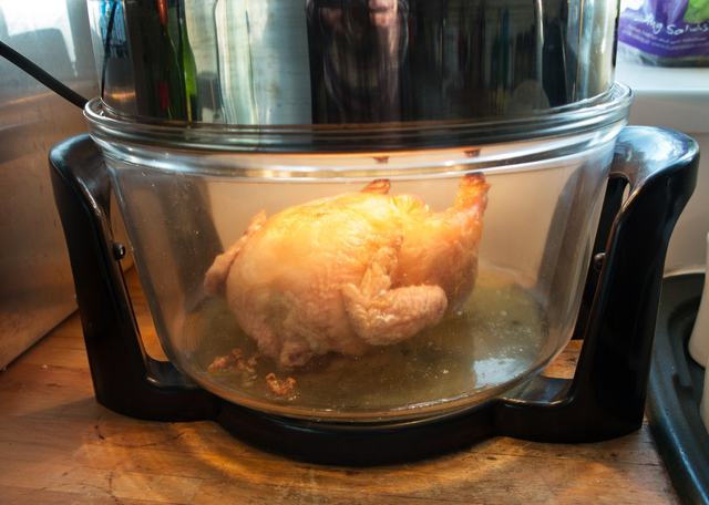 Ebben az eszközben nem fűtőszál, hanem egy halogénizzó szolgáltatja a sütéshez a hőt, melyet aztán ventilátorlapátok oszlatnak el egyenletesen a szintén kompakt kivitelű sütő belső terében.