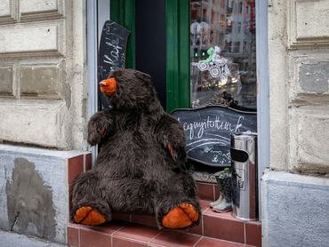 Lehet tél, tavasz, nyár vagy ősz, Bernát, a hatalmas, kiérdemesült medve évek óta ül egy lépcsőfeljárón a Szinyei Merse Pál és a Szondi utca sarkán.