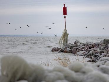A fagyok hatására az északi part térségében csütörtökre sokfelé egybefüggő tükörjég borította a tavat, a kicsapó hullámok pedig jégpáncélba öltöztették a part menti területeket, és az ott lévő padokat.