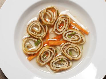 Az osztrák konyhában régóta ismert fogás a sós palacsintacsíkokkal kínált erőleves, amelyet Frittatensuppe néven emlegetnek. A hajszálvékonyra sütött, majd felcsíkozott palacsinta egészen más élményt ad, mint a hagyományos tészta, ugyanis rugalmas marad, miközben magába szívja a forró alaplé aromáit. Az eredmény egyszerre tartalmas és kifinomult.